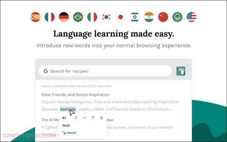 Toucan هي إضافة متصفح تسمح لك بتعلّم لغة جديدة عن طريق تصفح الإنترنت، أو أثناء تصفحك للإنترنت إن صحّ التعبير، كيف هذا؟ ... ببساطة حين تتصفح موقع معين فإن الإضافة تقوم بترجمة بعض الكلمات والجمل من تلك الصفحة إلى اللغة التي تريد تعلمها تِلْقائيًا، وهنا يمكنك تصفح الإنترنت والقيام بما عليك القيام به، وفي نفس الوقت تبدأ بالتقاط كلمات وتعابير جديدة من تلك اللغة التي تريد تعلمها، ودون الحاجة إلى تخصيص وقت محدد خلال اليوم لفعل ذلك، وكذلك مستوى الكلمات يزداد صعوبة مع مواصلتك لاستعمال الإضافة.