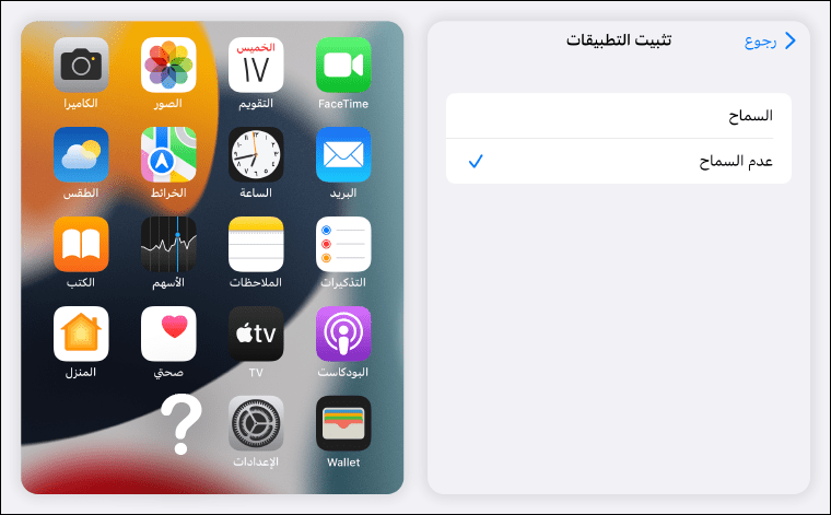 الآن قم بتبديل الخيار لتحديد "عدم السماح" Don't Allow ليتم بذلك حظر تنزيل أي تطبيقات جديدة على الهاتف. في الواقع، إذا قمت بالرجوع إلى الشاشة الرئيسية للآيفون لن تجد أيقونة متجر App Store موجودة، وحتى لو بحثت عن المتجر بين التطبيقات لن تعثر عليه، وبالتالي فإن المصدر الوحيد لتثبيت تطبيقات جديدة على الجهاز أصبح مخفي بشكل تام... إلى أن تسترجع ضبط إعداد "تثبيت التطبيقات" ليكون "السماح" Allow.
