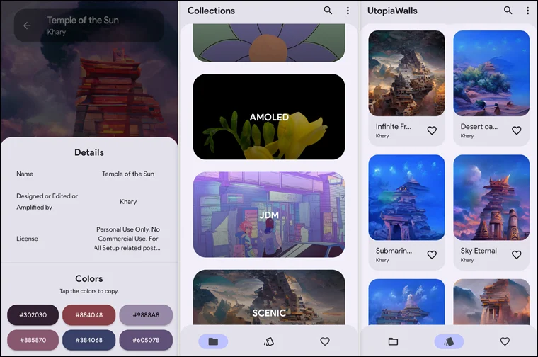 إذا أعجبتك اي خلفية اضغط عليها وستظهر مجموعة خيارات مثل التعرف على تفاصيل الصورة من حيث المُصمم أو المصور بالإضافة لمجموعة الألوان المستخدمة في الصورة، وهو شيء مثير للإعجاب! هناك أيضًا خيارًا لتعيين الخلفية مباشرًة دون الحاجة لتنزيلها أو إذا أردت الاحتفاظ بها في الاستوديو تستطيع النقر على زر Download. بشكل عام UtopiaWalls يعمل مثل تطبيقات كثيرة في فئته لكنه يتميز بالواجهة الحديثة وأيضًا تضمينه خلفيات رائعة تضفي طابع مميز لشاشة هاتفك. للأسف التطبيق غير متاح على جوجل بلاي حاليًا، لكن تستطيع تحميل ملف الـ APK من منصة GitHub وتثبيته يدويًا بسهولة. [تحميل التطبيق: Android]