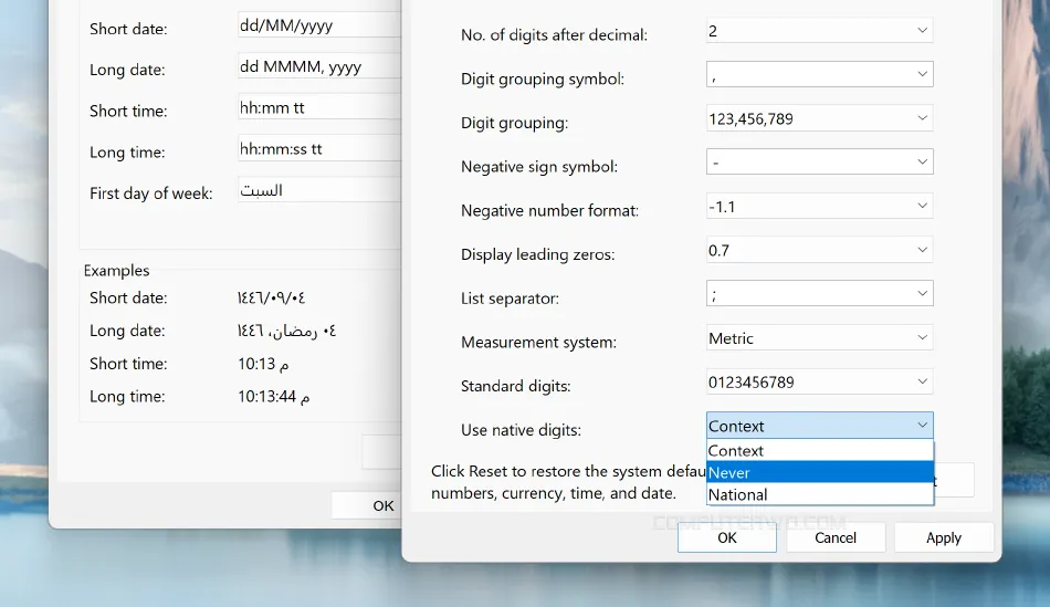 الضغط على قائمة "Standard Digits" لتختار صياغة الترقيم العربي بدلًا من العربي