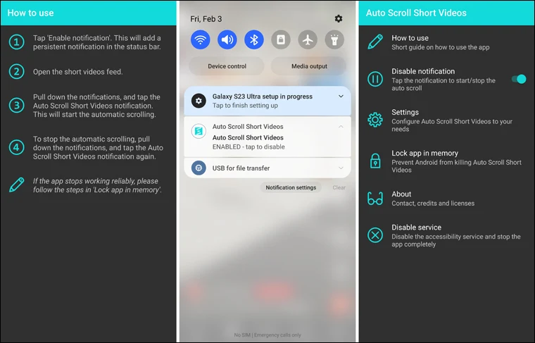 إذا كنت مدمنًا على مشاهدة مقاطع "شورتس" في تطبيق يوتيوب فربما يزعجك أن التطبيق لا يقوم افتراضيًا بالانتقال للمقطع التالي تلقائيًا، بل يقوم بتكرار المقطع الحالي عدة مرات حتى تقوم أنت بالتمرير إلى المقطع الذي يليه. تطبيق Auto Scroll Short Videos المجاني جاء لحل هذه المشكلة، فكما يوحي أسمه يقوم التطبيق بالتمرير تلقائيًا أثناء مشاهدة مقاطع شورتس بحيث سيتكشف متى ينتهي المقطع الذي تشاهده ويقوم بالانتقال إلى المقطع التالي دون تدخل منك. بعد تشغيل التطبيق سيظل يعمل في الخلفية للقيام بوظيفته بمجرد فتح تطبيق يوتيوب وتصفح مقاطع شورتس، ويمكنك إيقافه/تشغيله مباشرًة من لوحة الإشعارات. التطبيق سهل وتحتوي إعداداته على خيارات مفيدة مثل التحكم في سرعة التمرير بين المقاطع وتعيين مُهلة لتجاوز مقاطع شورتس الدعائية.