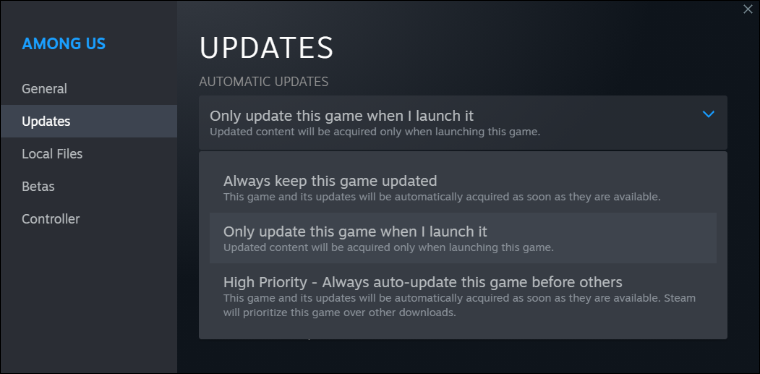 هذه خطوة اختيارية إذا كنت تريد الاستمتاع بنسخة اللعبة المرادة لفترة وجيزة من الزمن، أما إذا كنت تريد الاحتفاظ بها والاستمرار عليها لأطول فترة ممكنة، فهي خطوة واجبة، ولتعطل التحديثات التلقائية للعبة كل ما عليك هو الضغط على اسمها كليك يمين في قسم Library ثم اختيار Properties. من النافذة التي تظهر توجه إلى قسم Updates ثم في قائمة Automatic Update تأكد من تحديد خيار Only update this game when I launch it وليس Always keep this game updated وهذا يعني أن اللعبة لن تلقى أي تحديثات إلا إذا قمت بتشغيلها. وإذا لم تكن تريد أن تعطل التحديثات بشكل عام، فيمكنك أن تلعب في وضع Offline أو عن طريق إيقاف اتصال الإنترنت.