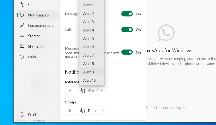 من ضمن الإضافات الجديدة التي لم تكن تتوفر في نسخة WhatsApp Desktop القديمة أو حتى في موقع "واتساب ويب" حاليًا هي إتاحة القدرة على تخصيص نغمة الإشعارات للرسائل الجديدة. تطبيق واتساب لويندوز يسمح بفعل ذلك وبنفس الآلية الموجودة في نسخة التطبيق للهواتف الذكية، إذ يمكن اختيار نغمة إشعارات للمحادثات الفردية أو المجموعات أو لجهات اتصال مُعينة، علاوًة على ذلك، يأتي مع التطبيق عدة نغمات جاهزة يستطيع المستخدم اختيار المناسب منها. فقط اضغط على زر الإعدادات (⚙) الموجود في الركن السفلي الأيسر ثم انتقل إلى قسم "Notifications" وأختر نغمة من قائمة Message notifications أو Group notifications كما يمكنك الضغط على اسم جهة الاتصال داخل المحادثة لتعثر على خيار تحديد نغمة للرسائل الجديدة التي تأتيك من هذا الشخص تحديدًا.