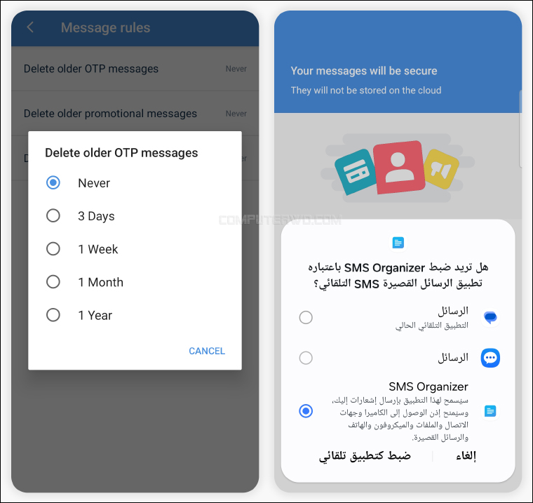 بعد تثبيت وتشغيل SMS Organizer على هاتفك الأندرويد، ستحتاج أن تقوم بتعيينه كتطبيق افتراضي لإدارة رسائل SMS القصيرة، فأضغط على "ضبط كتطبيق تلقائي" Set as Default. بعد ذلك اضغط على زر القائمة ( ⁝ ) واختر منها "Settings" ثم انتقل إلى قسم "Message rules" واضغط على "Delete older OTP messages" وبعدها حدد المدة بحيث يقوم التطبيق بحذف رسائل OTP عندما تصل إلى تلك المدة.